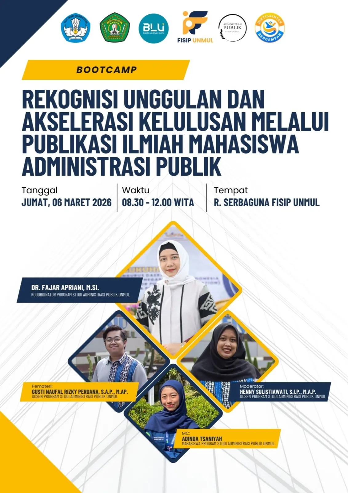 Program Studi Administrasi Publik Fakultas Ilmu Sosial dan Ilmu Politik (FISIP) Universitas Mulawarman kembali menunjukkan komitmennya dalam meningkatkan kualitas akademik mahasiswa melalui penyelenggaraan kegiatan Bootcamp Ruang Publik yang dilaksanakan pada Jumat, 06 Maret 2026 bertempat di Ruang Serbaguna FISIP Universitas Mulawarman. Kegiatan ini menghadirkan Gusti Naufal Rizky Perdana, S.A.P., M.AP. sebagai pemateri utama.