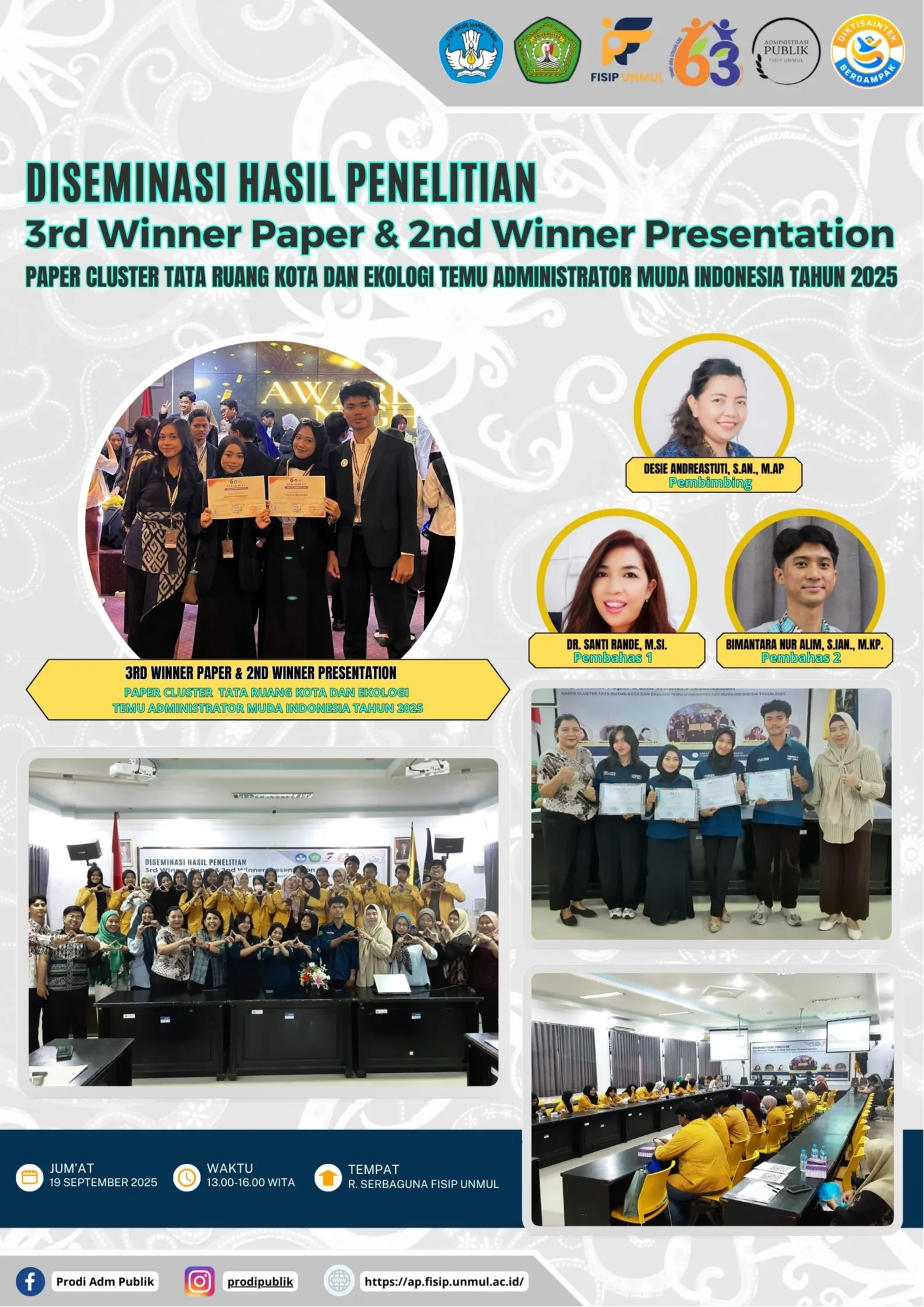 Tanggal 19 September 2025, Program Studi S1 Administrasi Publik Fakultas Ilmu Sosial dan Ilmu Politik (FISIP) Universitas Mulawarman melaksanakan kegiatan diseminasi hasil penelitian 3rd Winner Paper & 2nd Winner Presentation Paper Cluster tata ruang kota dan ekologi Temu Administrator Muda Indonesia Tahun 2025.