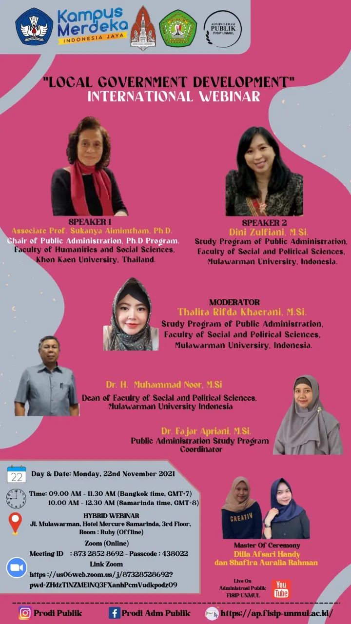 Kegiatan International Webinar “Local Government Development” Program Studi S1 Administrasi Publik Fakultas Ilmu Sosial dan Ilmu Politik Universitas Mulawarman ini dilakukan secara daring dan luring pada hari Senin, tanggal 22 November 2021, pukul 10.00 – 12.30 Wita di Room Ruby, Hotel Mercure Samarinda Lantai 3.