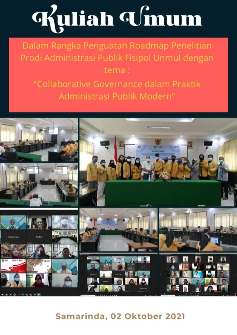 Samarinda, 2 Oktober 2021 — Dalam rangka memperkuat arah dan fokus penelitian, Program Studi Administrasi Publik, Fakultas Ilmu Sosial dan Ilmu Politik, Universitas Mulawarman menyelenggarakan Kuliah Umum bertema “Collaborative Governance dalam Praktik Administrasi Publik Modern” pada Sabtu, 2 Oktober 2021, bertempat di Samarinda.