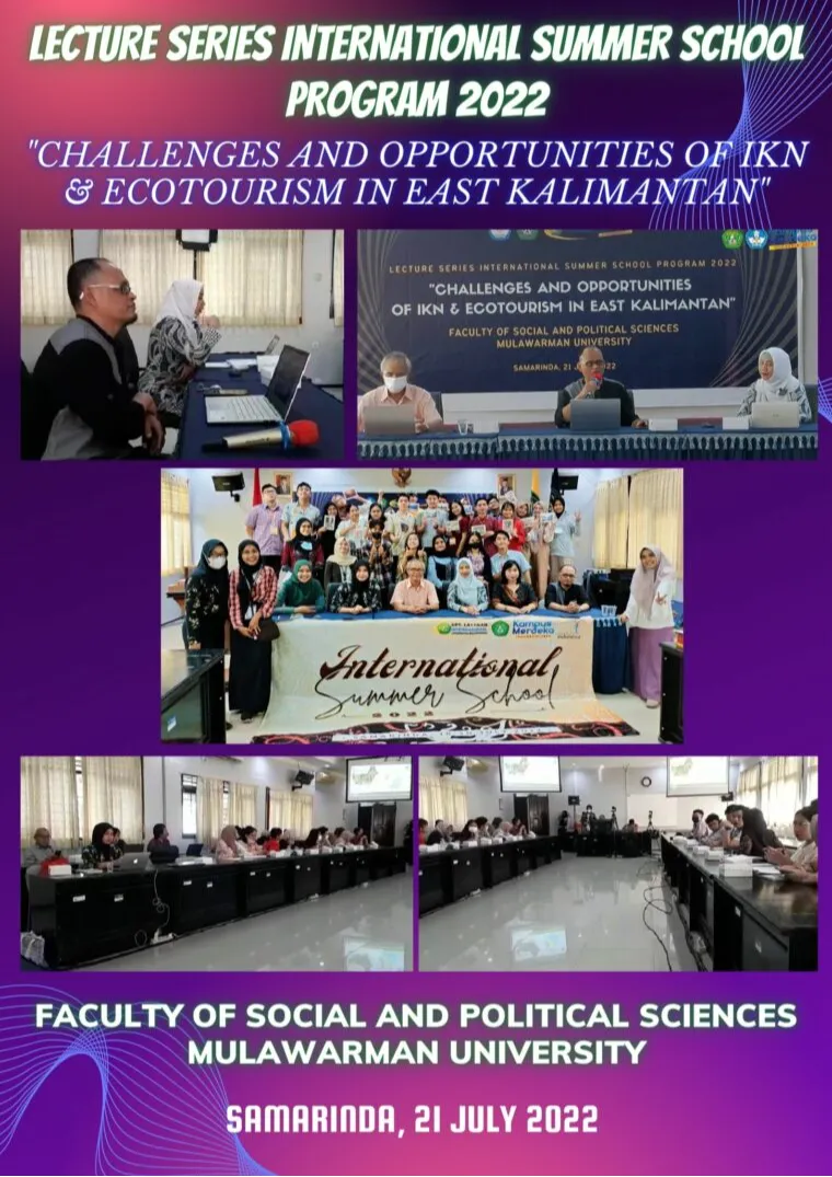 Samarinda, 21 Juli 2022 — Fakultas Ilmu Sosial dan Ilmu Politik (FISIP) Universitas Mulawarman sukses menyelenggarakan kegiatan Lecture Series International Summer School Program 2022 dengan tema “Challenges and Opportunities of IKN & Ecotourism in East Kalimantan”, pada Kamis, 21 Juli 2022, di Samarinda.