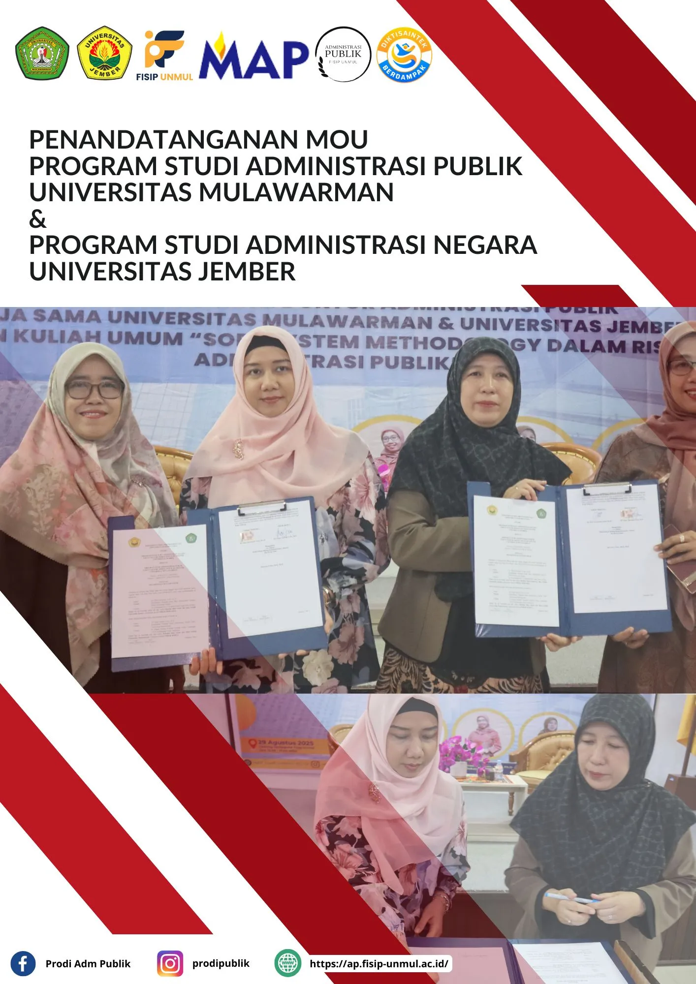 Program Studi Administrasi Publik Universitas Mulawarman (UNMUL) dan Program Studi Administrasi Negara Universitas Jember (UNEJ) resmi menjalin kerja sama melalui penandatanganan Memorandum of Understanding (MoU) pada Jumat, 29 Agustus 2025. Acara berlangsung di Gedung Serbaguna Fakultas Ilmu Sosial dan Ilmu Politik (FISIP) Universitas Mulawarman dengan suasana penuh kehangatan dan semangat kolaborasi.