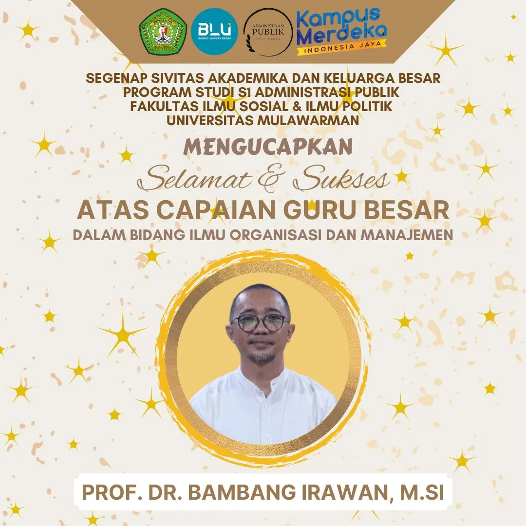 Segenap Sivitas Akademika dan Keluarga Besar Program Studi S1 Administrasi Publik Fakultas Ilmu Sosial & Ilmu Politik Universitas Mulawarman mengucapkan Selamat & Sukses kepada Prof. Dr. Bambang Irawan, M.Si atas capaian Profesor/Guru Besar.