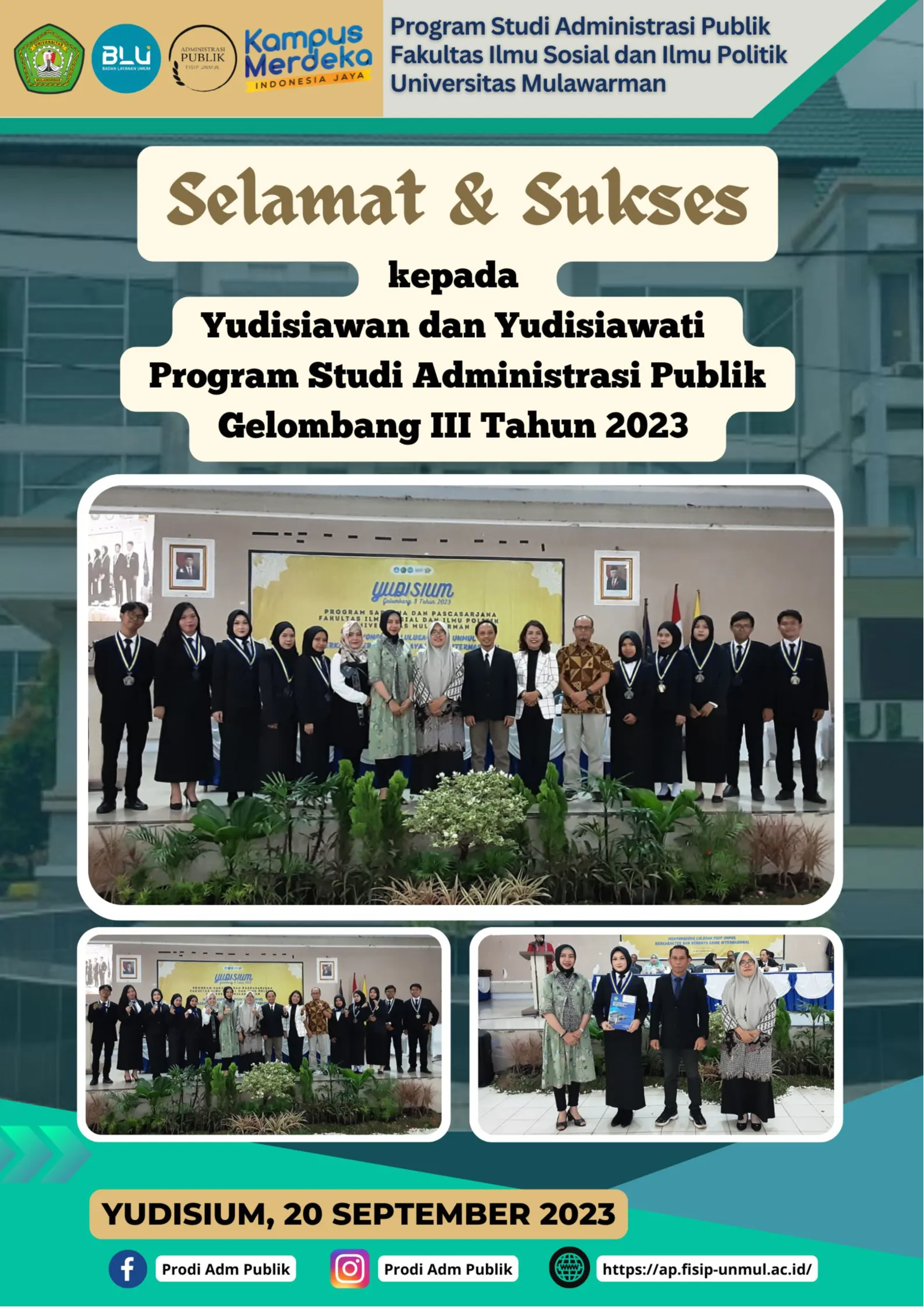 Samarinda 20 September 2023, Fakultas Ilmu Sosial dan Ilmu Politik menggelar Yudisium Gelombang III Tahun 2023 yang bertempat di Gedung Auditorium Universitas Mulawarman, Yudisiawan dan Yudisiawati Program Studi Administrasi Publik pada Yudisium Gelombang III Tahun 2023 ini berjumlah 12 orang.