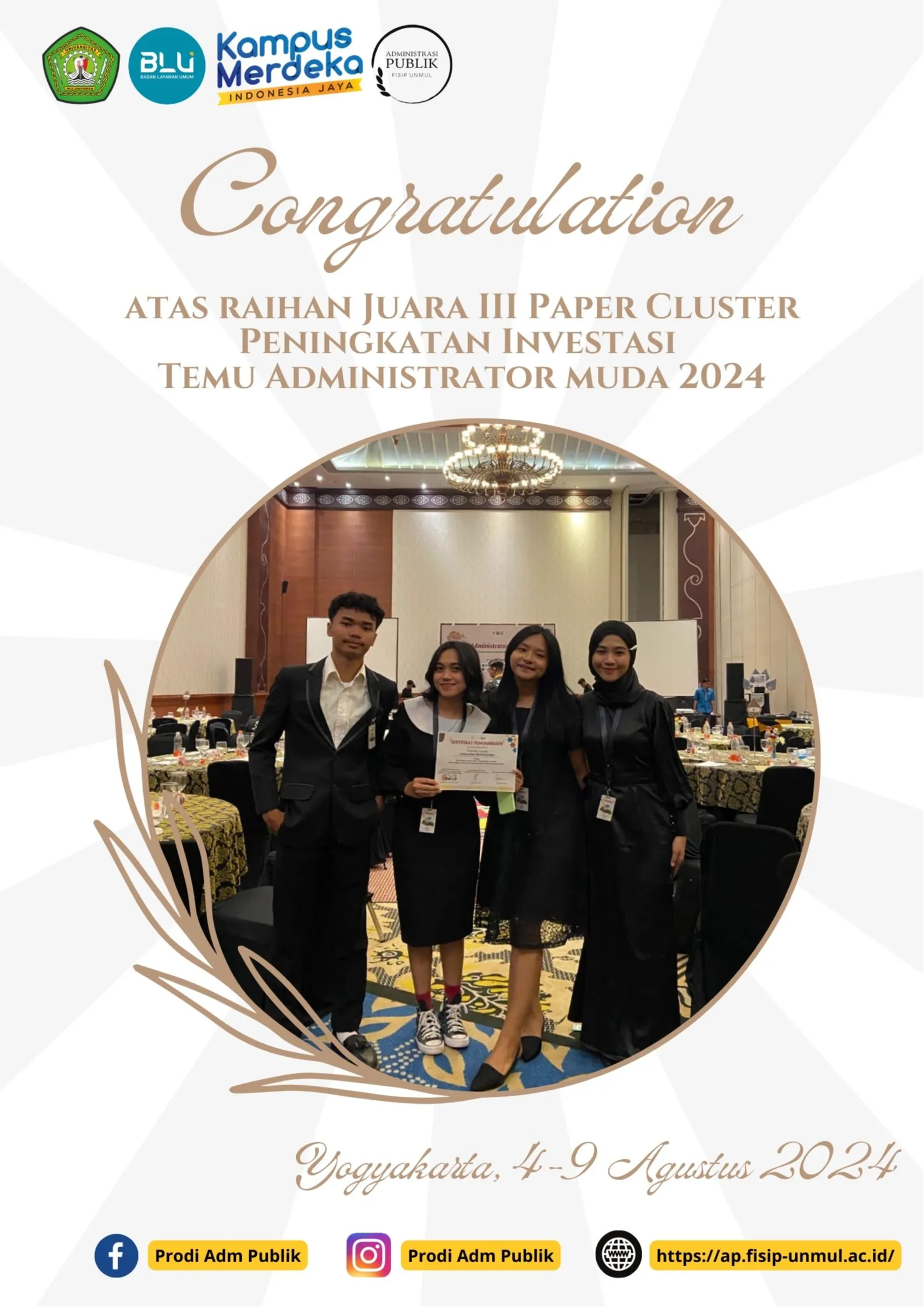 Prestasi sebagai Best Paper 3 untuk Cluster Peningkatan Investasi yang berjudul Penerapan Good Enviromental Governance dalam Mendukung Kebijakan Green Investment di Kota Samarinda diraih oleh delegasi Himanislik Fisip Unmul: Gita Riski Anggriani, Daffa Abi Permana, Iqie Venecia Auliyah Ayu dan Geby Cornelia. Penyusunan paper dibimbing oleh Prof. Dr. Hj. Aji Ratna Kusuma, M.Si. Best Paper 1 diraih oleh delegasi dari Universitas Indonesia dan Best Paper 2 diraih oleh Universitas Jenderal Soedirman.