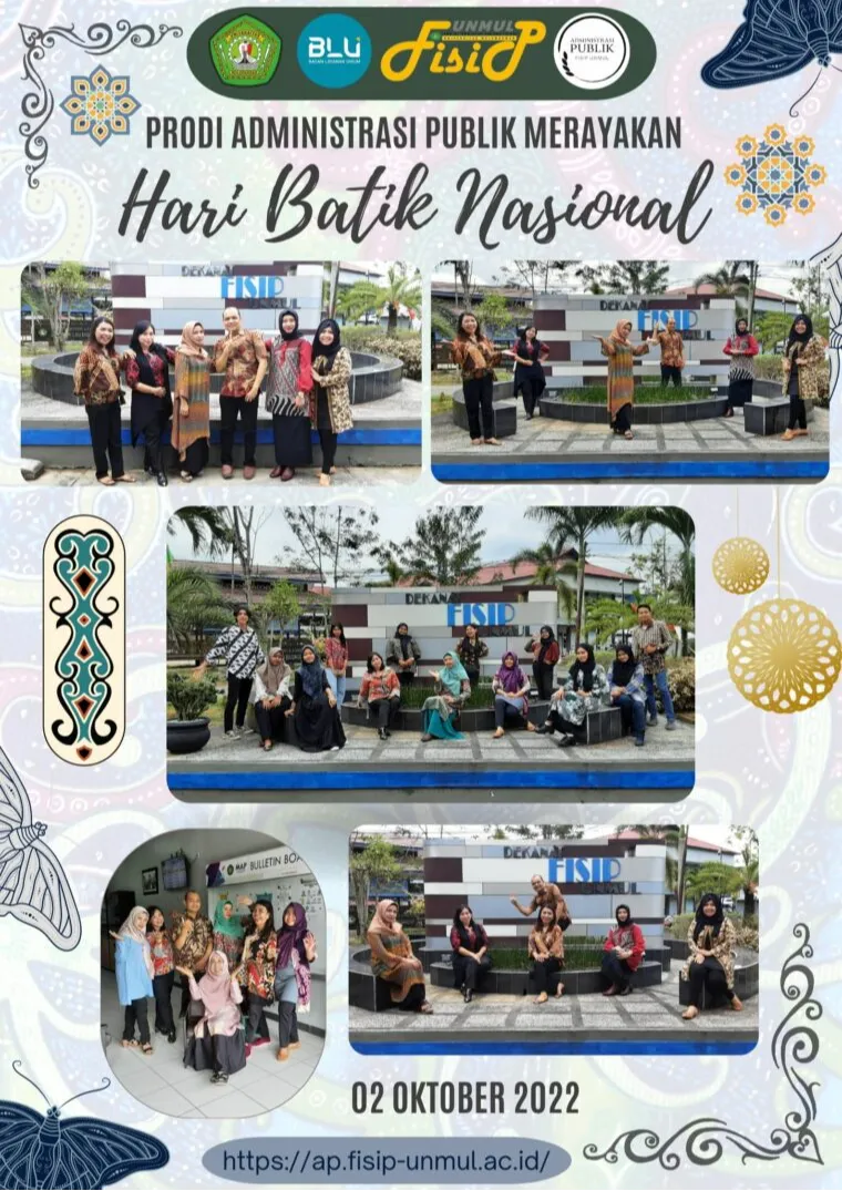 Program Studi Administrasi Publik Fakultas Ilmu Sosial dan Ilmu Politik Universitas Mulawarman mengucapkan Selamat Hari Batik Nasional yang diperingati setiap tanggal 2 Oktober. Semoga semangat dan nilai budaya batik terus dijaga dan dilestarikan sebagai warisan bangsa yang kaya akan makna dan keindahan.