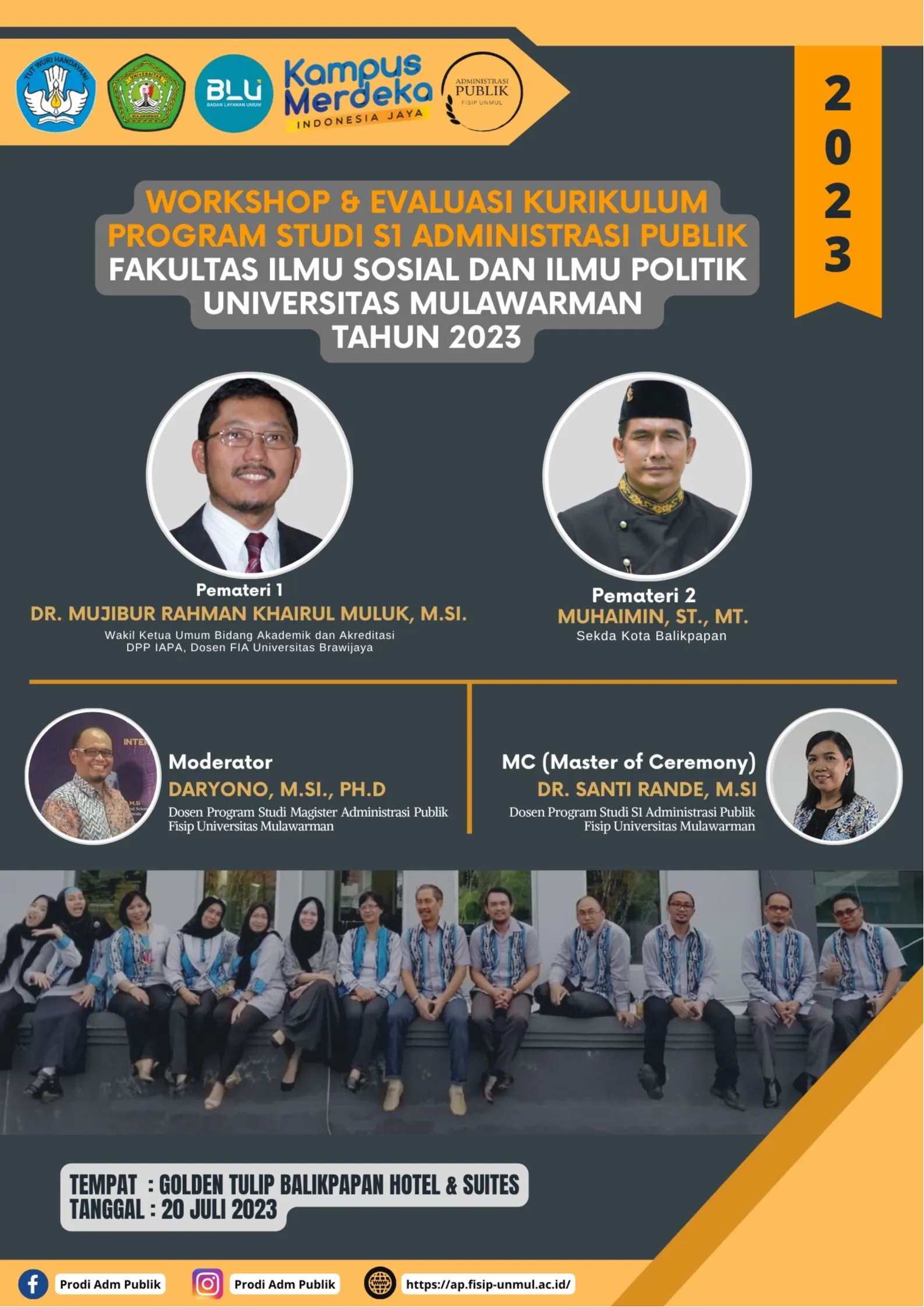 Pada tanggal 20 Juli 2023, Program Studi S1 Administrasi Publik Fakultas Ilmu Sosial dan Ilmu Politik Universitas Mulawarman telah melaksanakan kegiatan Workshop dan Evaluasi Kurikulum yang bertempat di Golden Tulip Balikpapan Hotel & Suites. Kegiatan ini menghadirkan narasumber ahli, yaitu Dr. Mujibur Rahman Khairul Muluk, M.Si., dan Bapak Muhaimin, ST., MT., yang memberikan materi serta arahan dalam rangka penyempurnaan kurikulum Program Studi.